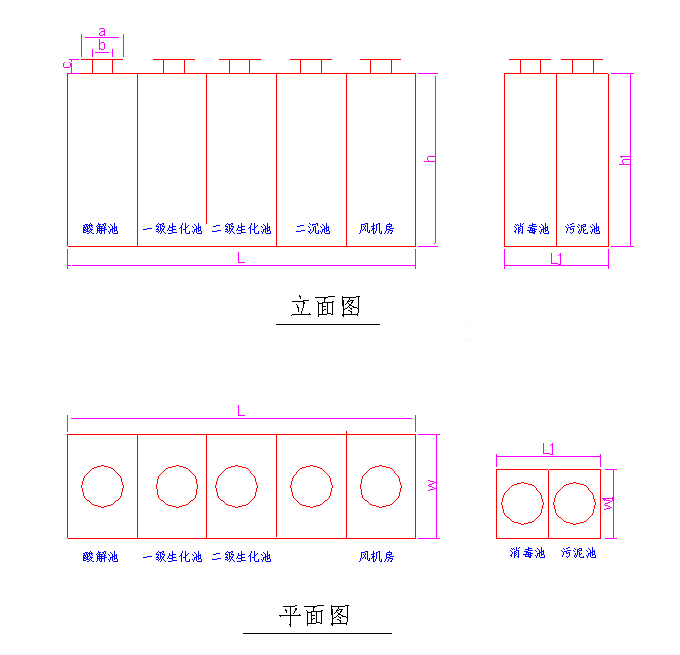3、生化池采用生物接觸氧化法,其填料的體積負荷比較低,微生物處于自身氧化階斷,產泥量少,僅需三個月(90天)以上排一次泥(用糞車抽吸或脫水成泥餅外運)。
