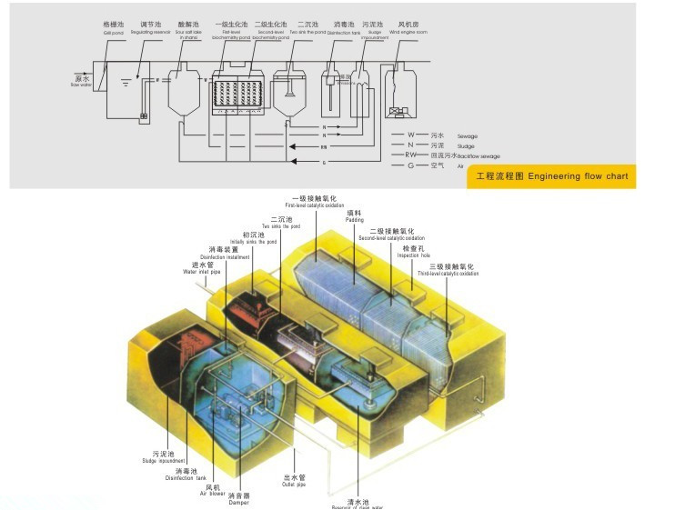 ■2、二級生物接觸氧化處理工藝均采用推流式生物接觸氧化,其處理效果優于完全混合式或二級串聯完全混合式生物接觸氧化池。并比活性污泥池體積小,對水質的適應性強,耐沖擊負荷性能好,出水水質穩定,不會產生污泥膨脹。池中采用新型彈性立體填料,比表面積大,微生物易掛膜,脫膜,在同樣有機物負荷條件下,對有機物去除率高,能提高空氣中的氧在水中溶解度。
