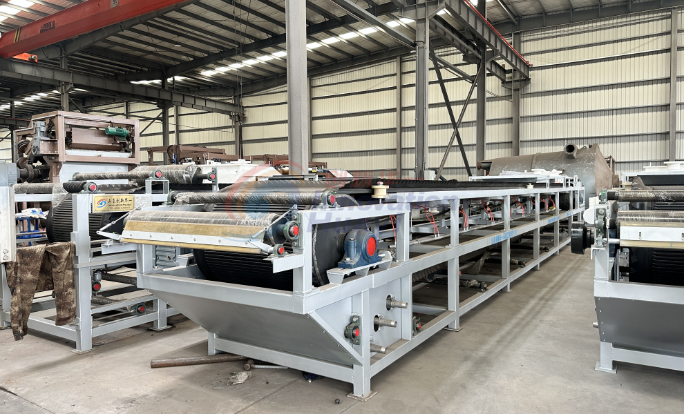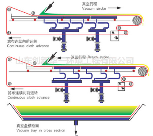 尾礦帶式真空過濾機采用了固定真空盒,膠帶在真空盒上滑動,真空盒與膠帶間構成運動密封的結構型式,以真空負壓為推動動力實現固液分離的設備。在結構上,過濾區段沿水平長度方向布置,能連續自動完成過濾、濾餅洗滌、卸 渣、濾布再生等工藝操作,并且母液有與濾餅洗滌洗液可以分段收集。具有過濾效率高、生產能力大、洗滌效率好,濾餅水分低、操作靈活、維護簡單等優點。