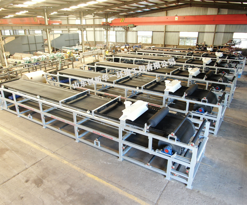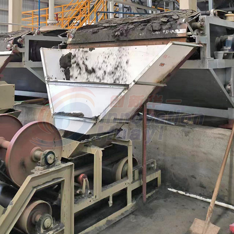 尾礦帶式真空過濾機采用了固定真空盒,膠帶在真空盒上滑動,真空盒與膠帶間構成運動密封的結構型式,以真空負壓為推動動力實現固液分離的設備。在結構上,過濾區段沿水平長度方向布置,能連續自動完成過濾、濾餅洗滌、卸 渣、濾布再生等工藝操作,并且母液有與濾餅洗滌洗液可以分段收集。具有過濾效率高、生產能力大、洗滌效率好,濾餅水分低、操作靈活、維護簡單等優點。